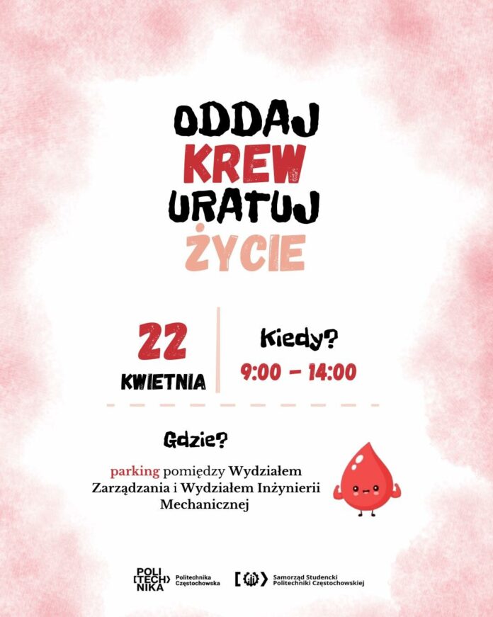 22 kwietnia 2026 roku na terenie Politechniki Częstochowskiej odbędzie się akcja mobilnego poboru krwi. Wydarzenie zaplanowano w godzinach 09:00–14:00.