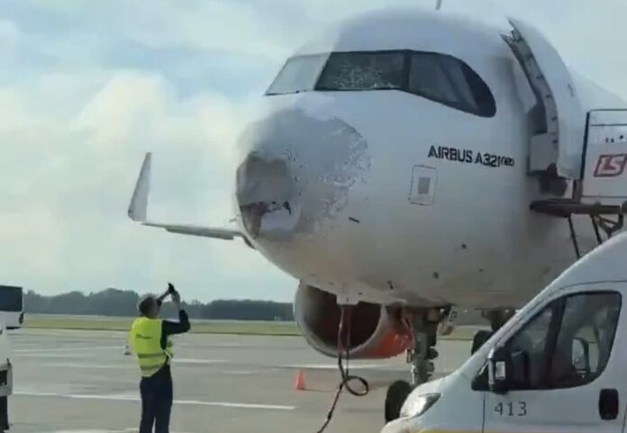 Grad mocno uszkodził nie tylko kadłub samolotu, ale również jego szyby.