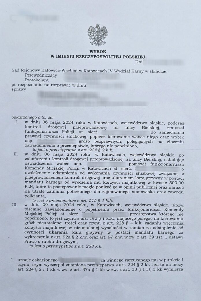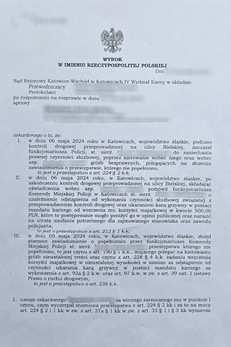 W Sądzie Okręgowym w Katowicach zapadł wyrok w sprawie 70-latka, który złożył fałszywe zawiadomienie przeciwko policjantowi po kontroli drogowej. Mężczyzna został ukarany grzywną oraz nawiązką na rzecz pomówionego funkcjonariusza.