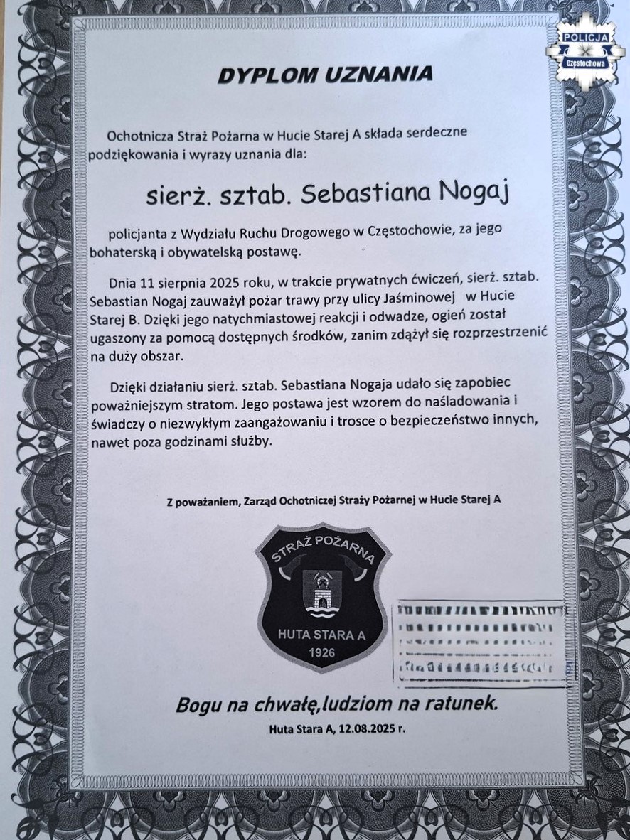 Sierżant Sebastian Nagaj z częstochowskiej drogówki podczas wieczornego spaceru w Hucie Starej B zauważył pożar i podjął natychmiastowe działania, które zapobiegły jego rozprzestrzenieniu się.