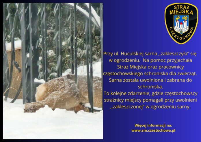 Sarna zaklinowała się w ogrodzeniu przy ul. Huculskiej w Częstochowie. Po otrzymaniu zgłoszenia na miejsce przybyli strażnicy miejscy oraz pracownicy schroniska dla zwierząt. Wspólnymi siłami uwolnili sarnę, która następnie została przewieziona do schroniska, gdzie otrzymała niezbędną pomoc.