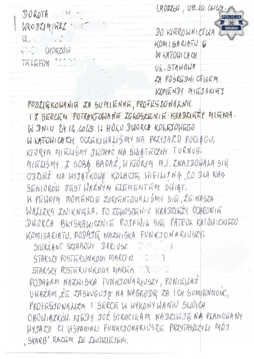 Po świętach do Komendanta Miejskiego Policji w Katowicach dotarł list z podziękowaniami od seniorów. W swoim piśmie wyrazili oni wdzięczność za profesjonalizm i sumienność funkcjonariuszy, dzięki którym mogli spędzić „cudowne i niezapomniane święta”. Seniorzy przekazali również noworoczne życzenia dla wszystkich policjantów, życząc im wytrwałości, życzliwości ze strony obywateli oraz spełnienia marzeń.
