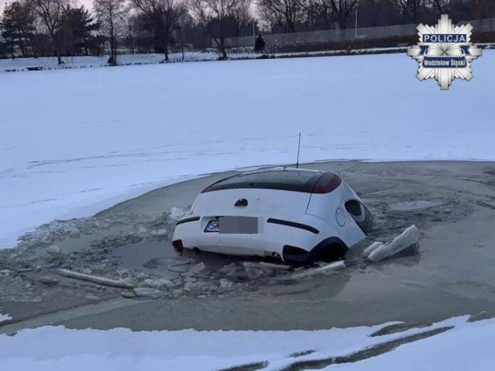 Wodzisławscy policjanci prowadzą postępowanie w sprawie niebezpiecznego incydentu, do którego doszło na zamarzniętym zbiorniku wodnym przy ulicy Młodzieżowej. Samochód wjechał tam na lód, który nie wytrzymał ciężaru pojazdu. Auto zatonęło, a nagranie zdarzenia trafiło do internetu.