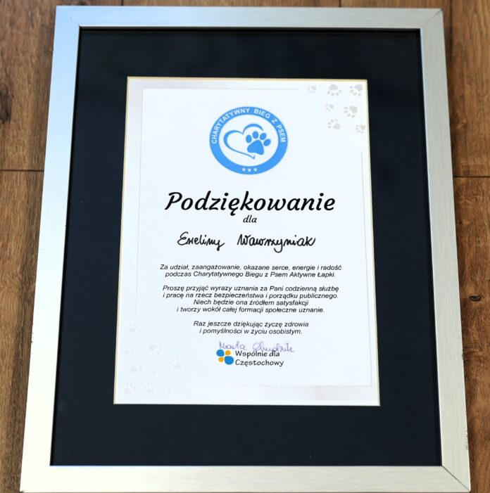 Przedstawicielki częstochowskiej Straży Miejskiej otrzymały podziękowania za udział w Charytatywnym Biegu z Psem „Aktywne Łapki”. Podczas wydarzenia pełniły rolę edukacyjną, informując uczestników o ekologii.