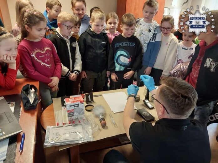 Podczas wizyty w oleskiej komendzie uczniowie mieli możliwość zwiedzenia miejsc na co dzień dostępnych jedynie dla funkcjonariuszy. Jednym z głównych punktów programu był pokaz technik kryminalistycznych, gdzie policyjny technik zaprezentował, jak ujawniać i utrwalać ślady, używając m.in. promieni UV. Dzieci mogły również zobaczyć narzędzia używane w codziennej pracy policji.