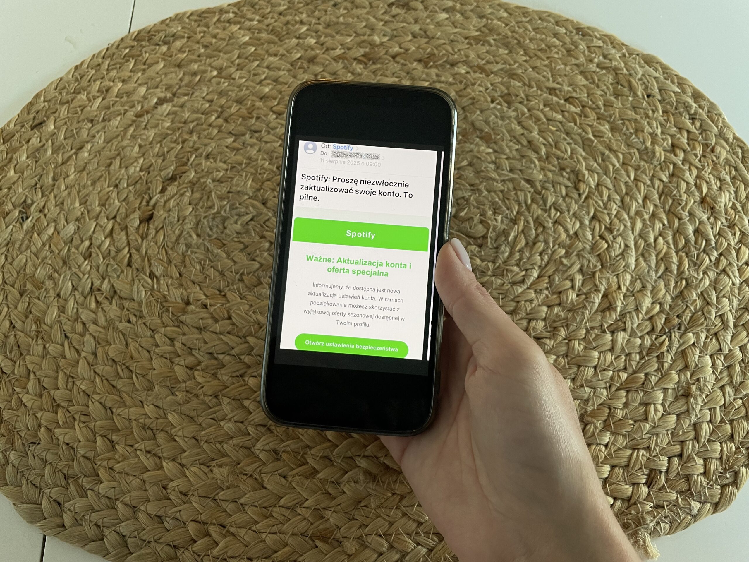 W ostatnim czasie obserwowane są wiadomości rzekomo wysyłane przez Spotify. Oszuści informują w nich o problemach z płatnością, konieczności potwierdzenia danych lub grożą zablokowaniem konta. W treści znajduje się odnośnik, który prowadzi do strony podszywającej się pod oficjalny serwis streamingowy.